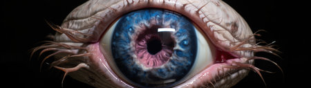 Intense Stare Woman with Glossy Black Makeup and Striking Blue Eyes in Dramatic Close-Up