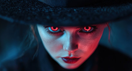Mysterious woman with glowing red eyes in the dark