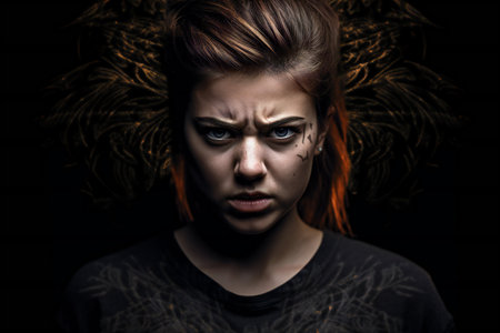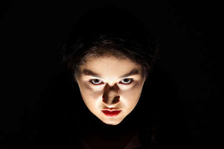 Scary portrait of angry woman against black background