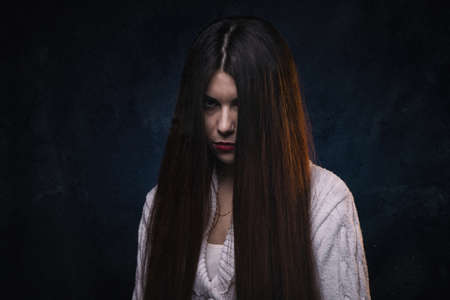 Horror film, thriller. Close-up portrait of a ghost girl with evil shining in the dark eyes and black hair staring intently at the camera. Halloween.