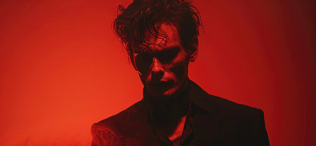 a close-up of a person enveloped in red and orange lighting, emanating a devilish aura. The play of shadows and intense hues symbolizing the allure of temptation and the darker aspects of human nature