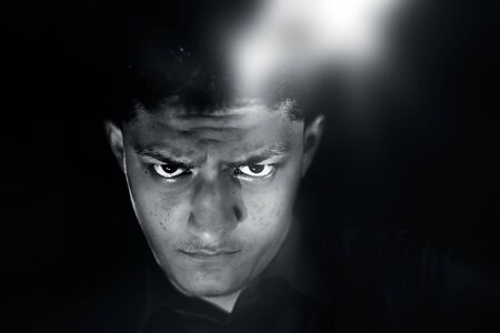 Close-up portrait of a young man with a scary look on his face