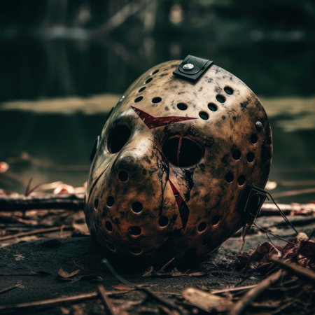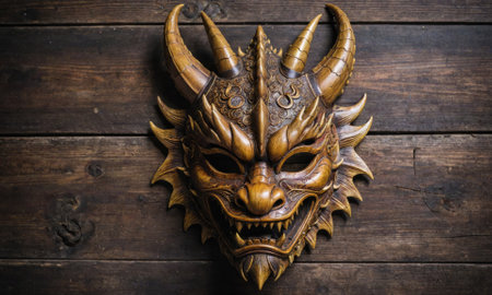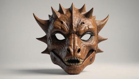 A striking sculpted mask with hollow eyes is displayed against a dark textured background evoking an aura of mystery and intrigue.