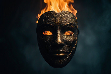 Man in a carnival mask with fire on a black background.