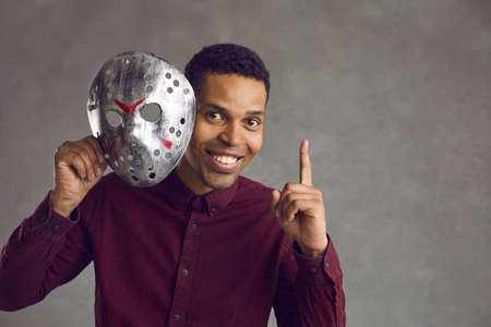 Happy kind handsome young black man isolated on grey studio background takes creepy ugly maniac mask off his face, looks at camera, points up and smiles to show he can be different