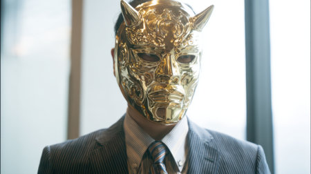 A man dressed in a formal suit stands confidently in a modern urban environment, sporting a striking golden mask with horns. The bright daylight illuminates the scene.