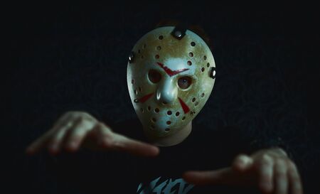 Man hockey mask, killer costume. Halloween day concept. Image includes a effect the black and white tones.