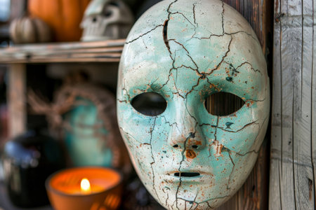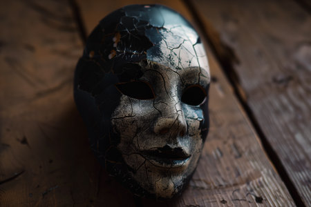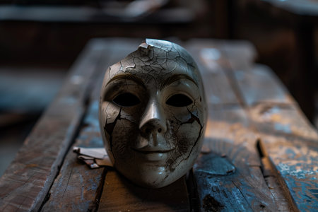 A cracked ceramic mask rests on a weathered wooden surface, the fractured surface suggesting age and fragility. The dark eye sockets contrast with the faint smile, enhancing the eerie effect.