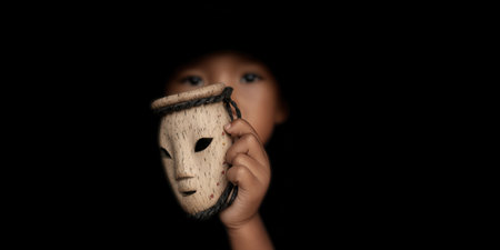 A young child delicately holds a traditional wooden mask, creating an atmosphere of mystery and cultural depth, captured in a striking portrait style.