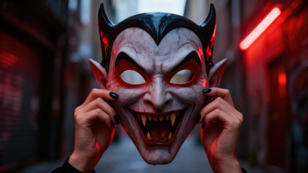 Halloween. A close up shot of a person holding a vampire mask with sharp fangs. The background is a dark alley with red lights, creating a spooky atmosphere.