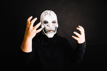 Horror devil costume with spooky pumpkin skull in black dressed for halloween carnival. Devil cosplay holding ghost mask and raise hand with blank copy space for your advertising content.
