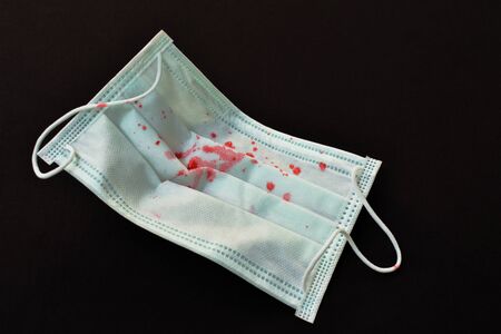 Halloween in Covid-19 Situation Concept. Person Wearing a Surgical Mask as Make-up and Paint with Blood. Scary Horror Face. Dark Tone. Closeup shot
