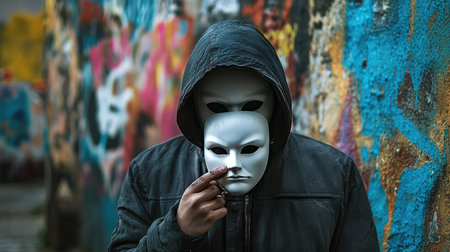 A dramatic shot of a hooded man holding a white mask in front of his chest, against a graffiti-covered wall.