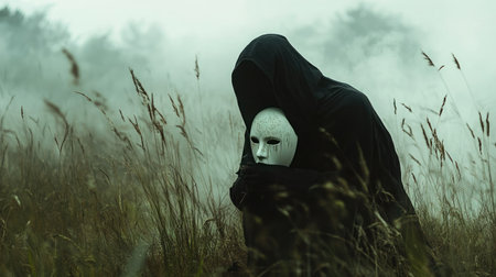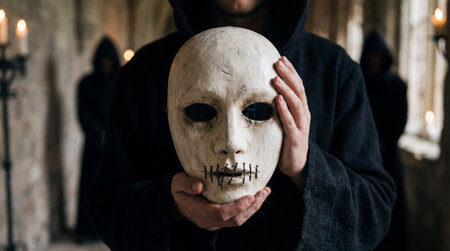 Mysterious hooded figure holding eerie stitched mouth white mask in dark candlelit hallway with shadowy cloaked silhouettes.