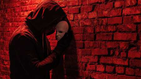 A mysterious man in a hoodie leaning against a brick wall, holding a white mask under dim red lighting.