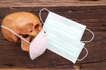 A human skull in a medical mask on the background of the world map Concept: mortality from coronavirus, global pandemic, infection with a deadly
