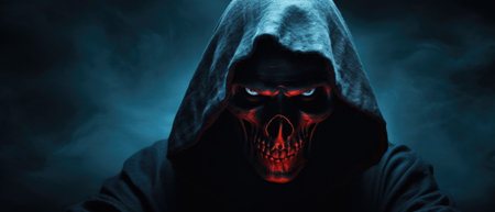 Scary monster or grim reaper ghost coming out of the dark shadows to haunt during Halloween. Depicts a scary and deadly fictitious demon
