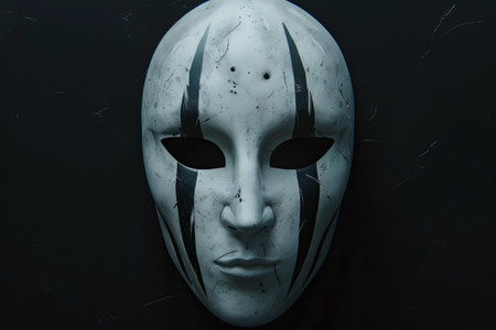 A white mask with three black stripes on the forehead, black background, horror game style, front view, simple design, high resolution, epic composition, concept art