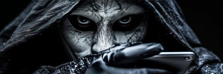 mask of a man in a black cloak and a hood on the street