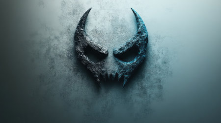 A striking skull design appears carved into a textured surface, radiating an eerie glow in twilight.