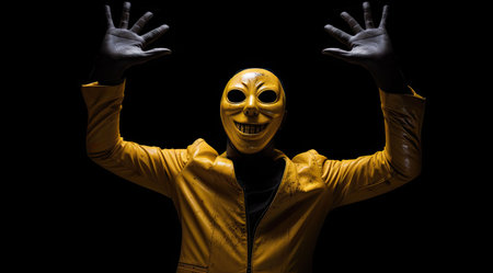 An AI generated illustration of a person in a mysterious yellow mask on a dark background