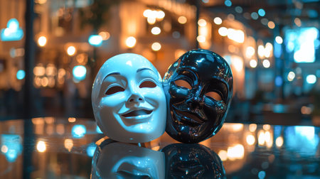 Close-Up of Happy White Mask and Sad Black Mask Reflecting Dramatic Emotions in Dimly Lit Setting. Concept of Theatrical Duality, Emotional Expression, Surreal Art, Contrasting Moods.