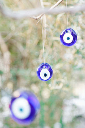 Close up of evil eye beads hanging on rope at the tree. Superstition evil eye.