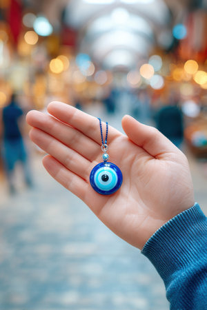 A hand displays a blue eye amulet pendant in a lively market, surrounded by colorful bokeh lights, emphasizing cultural significance and craftsmanship. turkish