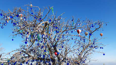 The branches of the old tree decorated with the eye-shaped amulets - Nazars, made of blue glass and believed to protect against the evil eye in Goreme national park, Cappadocia, Turkey.