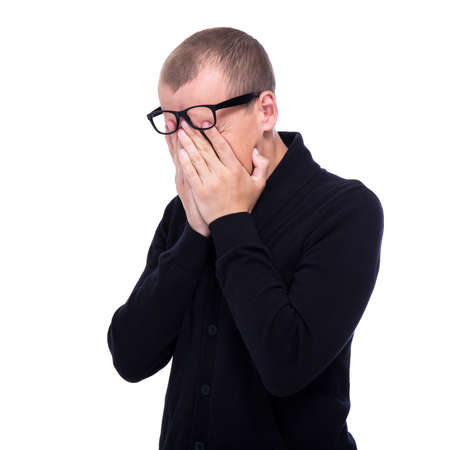 young man on a white background looking disappointed and disappointed. Concept different expressions.