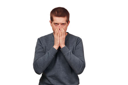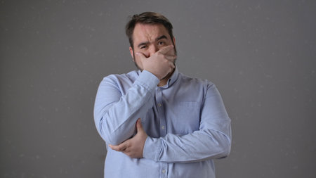 Allergy. Handsome young man covering nose with hand while standing against grey background
