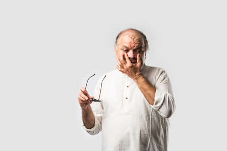 Indian asian old man having pain or ache in different body parts, sad expressions