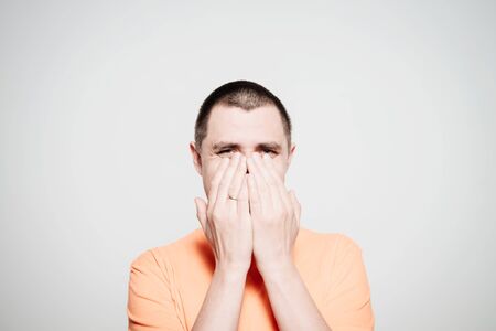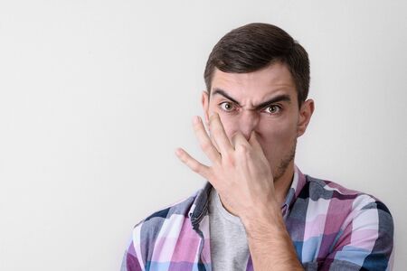 man clamps his nose with his hand from an unpleasant smell, looks at the camera, copy space