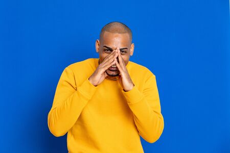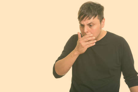 Regret and remorse. sad distraught man covering mouth with hand. portrait of a young handsome brunet guy on yellow background. emotion facial expression. feelings and people reaction concept.