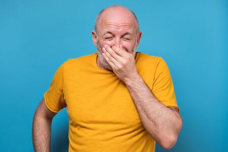 Close up portrait of coughing senior man with long beard. Isolated on yellow.