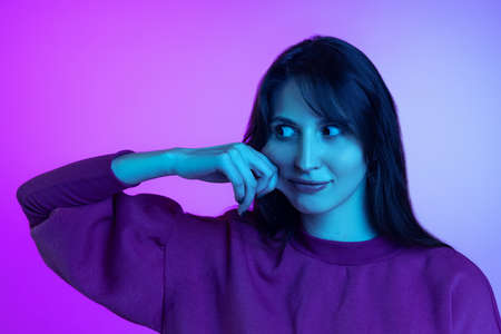 Young funny girl, student making crazy face isolated over purple studio background in neon light. Concept of emotions, facial expression, art, beauty
