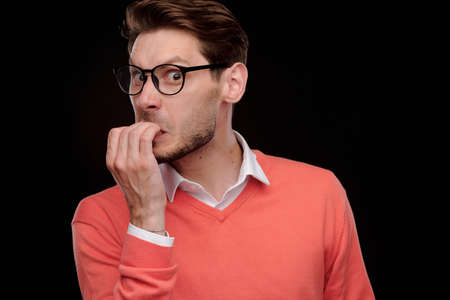Portrait of nervous young manager in orange sweater biting fingernails while having panic