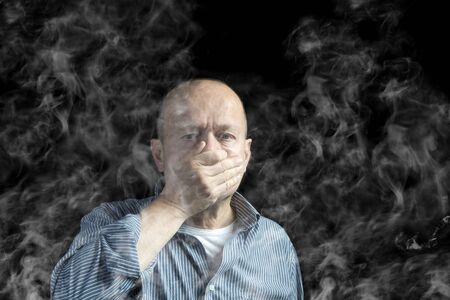 Suffocate in the smoke. Scared young man with stressed emotions isolated over pink background with clouds of smoke. Concept of facial expression, emotions