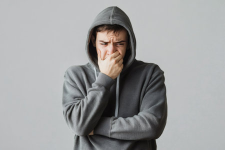 Young man in a gray hoodie feeling unwell, covering his mouth while coughing. Promoting cold and flu prevention