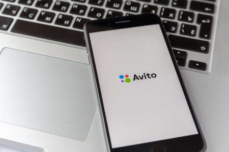 Moscow / Russia - April 10, 2019: The black iPhone lies on the MacBook. On-screen application Avito ads