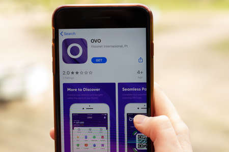 New York, USA - 1 May 2020: OVO app logo close-up on phone screen, Illustrative Editorial.
