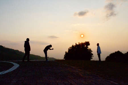 The three hikers walk trip, in the top of the sunrise.