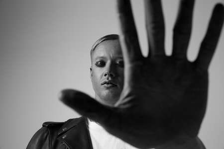 The guys face on a dark background, with an isolated light.