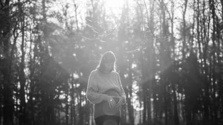Black and white image of young pregnant woman in last trimester making heart shape with her palms on a belly while walking in autumn forest.
