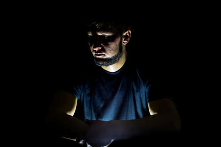 Portrait of a handsome young man in a dark room with light.