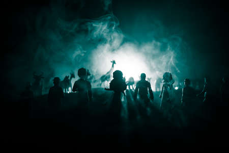 Animal protection concept. Silhouette of a group of people standing against group of animals in colorful dark backlight. Decorated with miniatures. Selective focus