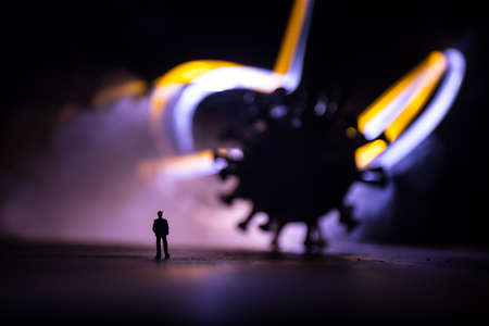 Corona virus global pandemic concept. Miniature man standing near big Corona virus novel in dark. Creative decoration with fog and backlight. Selective focus