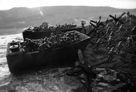 World War 2 reenactment (D-day). Creative decoration with toy soldiers, landing crafts and hedgehogs. Battle scene of Normandy landing on June 6, 1944. Selective focus