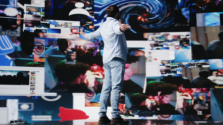 A person stands with their back turned, immersed in a vibrant display of diverse imagery, visualizing thoughts and ideas during a brainstorming process.