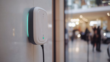 A compact electric vehicle charger stands on the wall, with an illuminated indicator, amidst a bustling city environment.